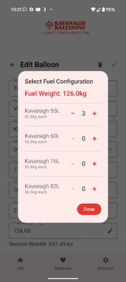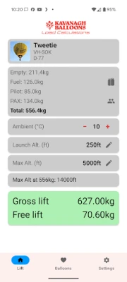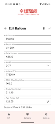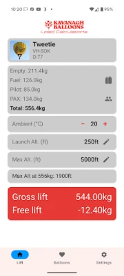 This app is not controlled and does not form part of the Kavanagh Balloons Flight manual or loading system. Always refer to the aircraft flight manual for actual loading calculations.