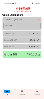 Quickly calculate the available lift for any volume of hot air balloon or specific models of Kavanagh Balloons.
