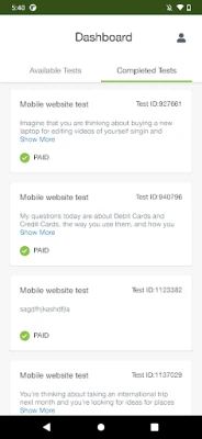 The Trymata app is for registered Trymata testers or guest testers to find and take paid tests of websites, apps, and other mobile products. During a Trymata test, you will record your screen and voice as you try to perform tasks on the target site/app, and give feedback about what you like and dislike, what's easy or difficult, and where you get frustrated or confused. The researchers running the tests will use your feedback to improve the user experience of their designs!