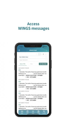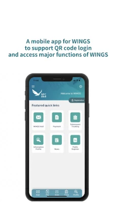 The current release of WINGS Mobile App supports quick sign-in to WINGS on web, WINGS Mail access, invoices payment, Submission Tracking, view Information Profile, shortcuts to related sites.