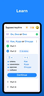 A learning process designed for you that is both easy and guided: You’ll feel like you’re learning more and more Russian every day. Every sentence, exercise, review, and reading has been carefully selected for you.